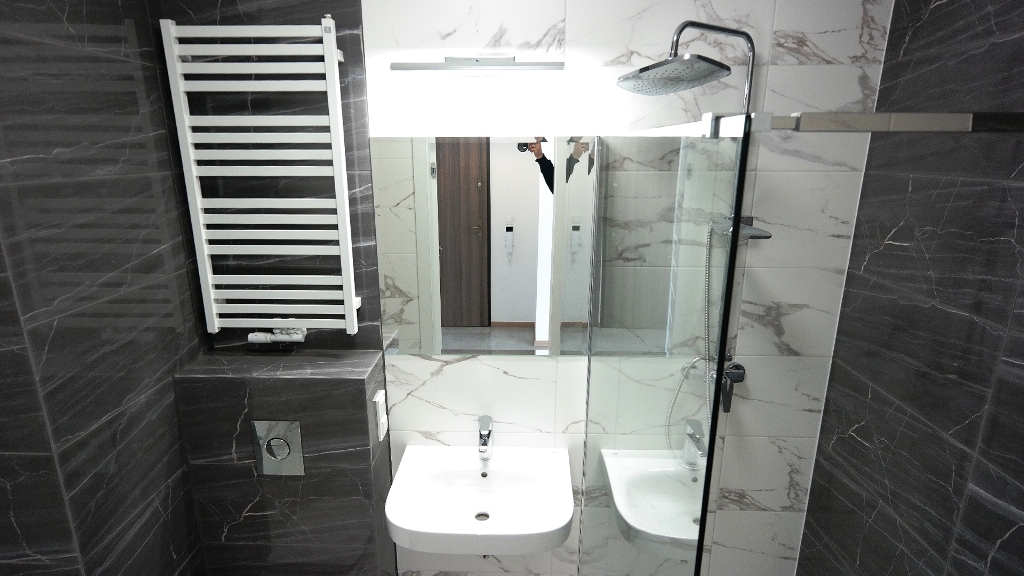 lustro, umywalka z baterią, odpływ liniowy, szyba wydzielająca brodzik, grzejnik drabinkowy, miska sedesowa zamontowana na stelażu